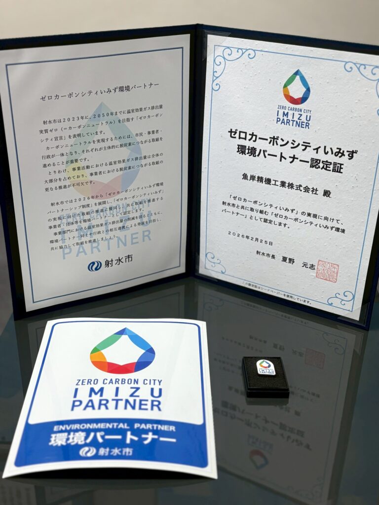 脱炭素への当社取組みがこの度、「ゼロカーボンシティいみず環境パートナーシップ制度」に認定されました。